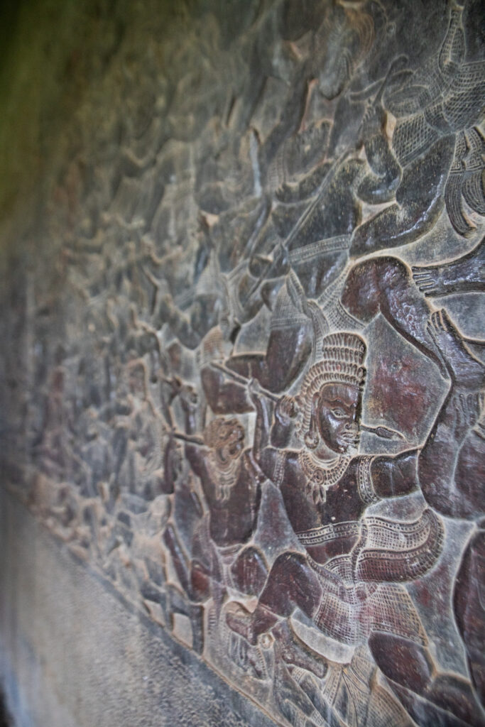Angkor Wat was originally built in 1150 CE as a Hindu temple dedicated to the deity Vishnu, but became a Buddhist temple soon after. It is the most well-known example of Khmer architecture. Once the sun has risen, it’s time to head inside the temple itself. The carvings in the long galleries are outstanding, the bas-relief friezes depicting huge scenes from Hindu mythology, including hundreds of figures in battle. The reliefs are amazingly preserved, and if you’re in Angkor Wat with a guide (definitely recommend), the stories are fascinating.