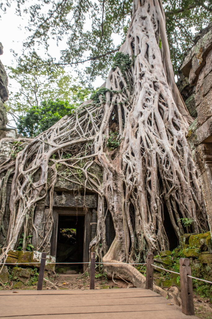 From a quiet temple to one of the busiest, Ta Prohm is a highlight of Angkor Wat and the Small Circuit. This is the famous ‘Tomb Raider’ temple, with the ruins taken over by towering Tetrameles trees, their roots taking hold in cracks between stones, while they themselves are taken over by strangler figs. It’s an incredible sight, the ruins and the jungle becoming a single entity in a maze of stone piles, narrow doorways and faces carved into the walls. Unlike many of the other temples at Angkor Wat that have been restored, Ta Prohm was deliberately left as it was found.