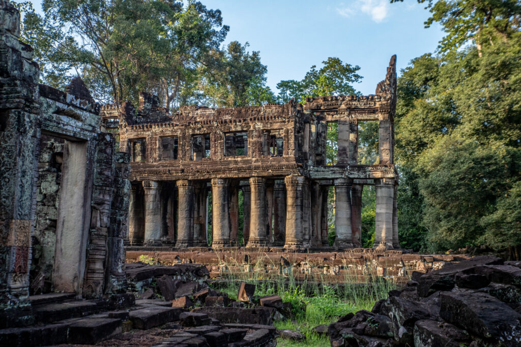 Not giving myself more time to explore Preah Khan is one of my biggest regrets of the day I cycled around the Grand Circuit. With the sun quickly dipping towards the horizon, I was worried about missing the sunset (which I did anyway), so I quickly walked through about half of the temple before running back to my bike. Similar to Angkor Wat, this temple is in the centre of a perfectly square area, surrounded by a moat. The jungle is thick here, the light dappling through the trees. This temple felt different to the others, with tall walls, massive piles of stone and lots of columns, giving parts of it an almost Grecian feel to it.