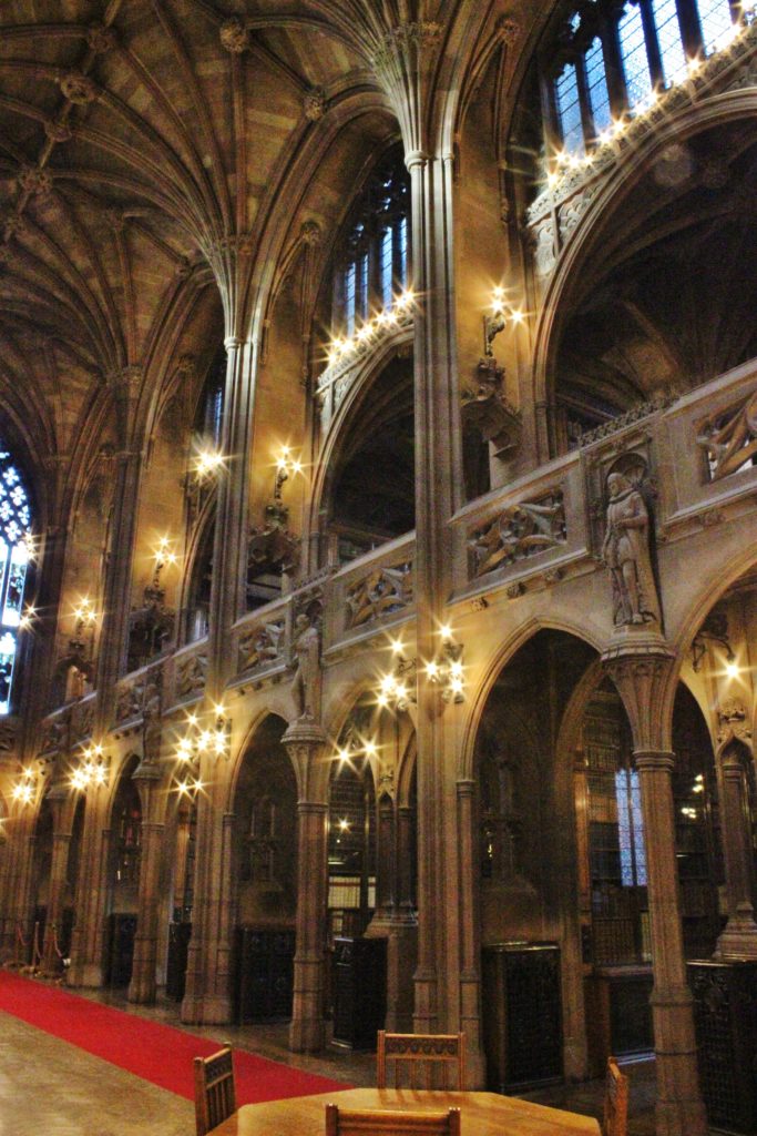 The exterior of the library is a mix of old and new, with red brick complemented by modern glass architecture. The older section was designed to look like a church, and the interior definitely looks more like a cathedral (or a Great Hall) than a library. It is a truly stunning place, with staircases lit by soft lighting, stone arches and vaulted ceilings. When I visited Oxford and the University complex there (which actually was used as an interior filming location for the Harry Potter films) a few years later, I was instantly reminded of the John Rylands Library.
