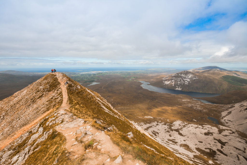 The first hour of the hike is up an extremely wet bog, though there is now a proper path dug through the area, making it much easier to navigate. I wish this path had been there when I hiked Errigal, because the trail was hard to follow, and most of the people around us very quickly gave up trying, instead making straight for the peak. It was a hard slog, and more than once I felt like turning back. And once we left the bog behind and reached the rocky upper slope of the mountain, it just got harder. But the higher you go, the more stunning the surroundings get. With Glenveagh National Park on one side, the Atlantic on the other and smaller mountains all around, by the time we reached the top, the hard slog had become the most satisfying hike I’d done in a long time.